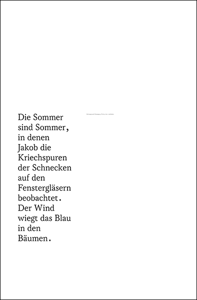 lässt, sich das Abzubildende auf gewisse Art zu eigen macht und sichtbare Spuren hinterlässt. Bei der Entwicklung der hier verwendeten Schrift Korpus (2009/11) verfolgten Mika Mischler und Nik Thoenen Untersuchungen zu Schrift und ihrer Reproduktionsproblematik im Buchdruck. Initial zur Formfindung war das Schriftmusterbuch der Großdruckerei und des Verlags Waldheim-Eberle aus Wien von 1920. Es handelte sich um Musterseiten mit Textbeispielen für literarischen Schriftsatz. Dieser war überraschend unregelmäßig abgesetzt, mit ungleichmäßiger Farbführung und unausgewogenem Abdruck präsentiert. Sie haben sich mit den reproduktionsabhängigen Merkmalen beschäftigt und damit begonnen, Regelmäßigkeiten unter den Unregelmäßigkeiten zu suchen. Es wurde das Mangelhafte gesammelt, das vom vermuteten Original Abweichende, um mögliche Verwandtschaften in der äußeren Erscheinung dieser Spuren zu erkennen. Die regelmäßig auftauchenden Unregelmäßigkeiten wurden übernommen und in die Korpus übersetzt. Genau jene Details, die unter anderen Gesichtspunkten als Makel gedeutet werden könnten, können auch als Spielart des Mediums, als Eigenleben der Technik gesehen werden, die hier in diesem personalisierten Schriftwurf A+ nochmals eine weitere Überhöhung durch die disproportionierte Betonung der Interpunktion findet, als wiederkehrende Halterung im Satzgefüge.